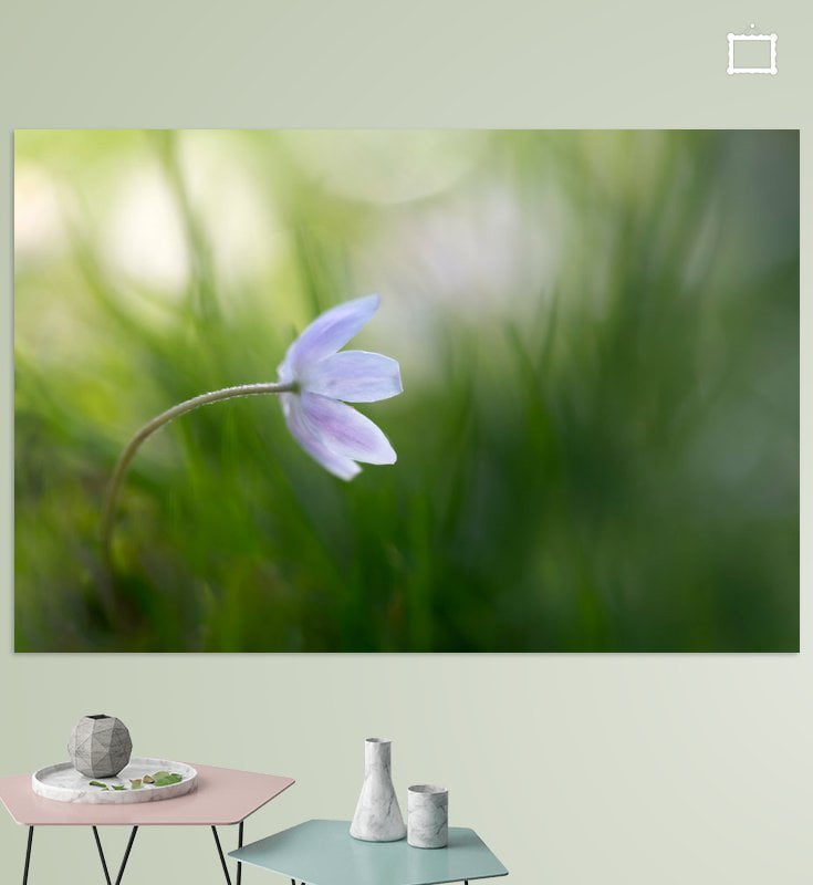 Deze bosanemoon is omgeven door mooi, groen gras. Doordat alleen de bosanemoon scherp in beeld is gebracht, heeft de foto een zachte. serene en rustige uitstraling. Deze foto is gemaakt met een macrolens (Canon 100mm f2.8 lens).